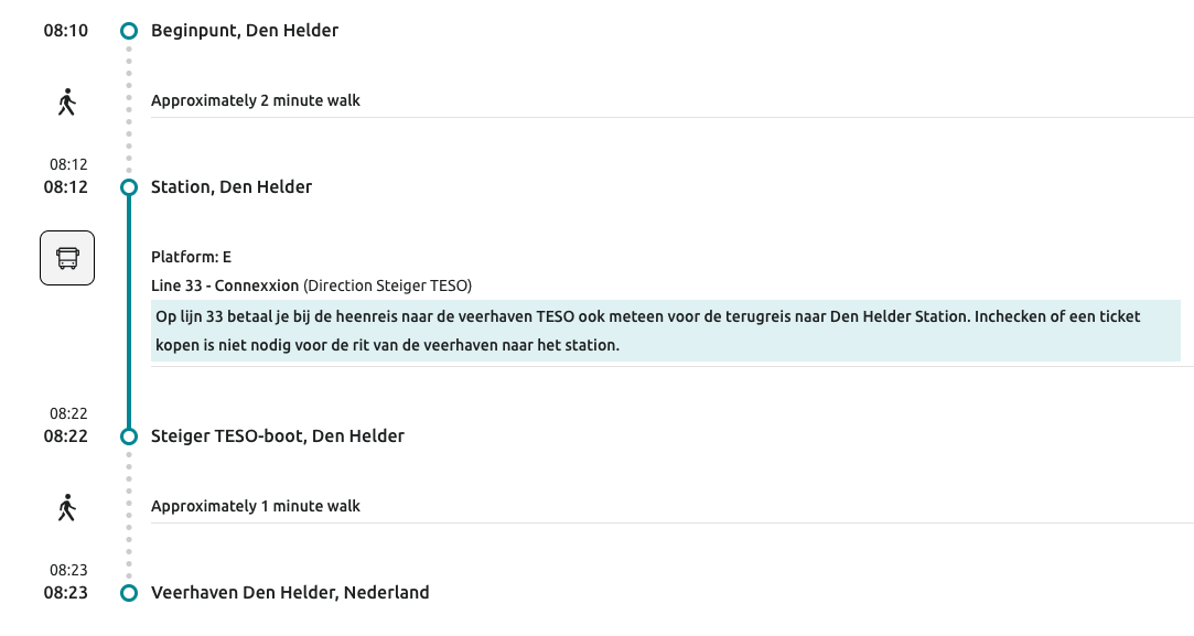 From the train station in Den Helder it's less than half an hour walk to the ferry - or there's the number 33 bus every half hour. On the return journey you don't need to pay for the bus!